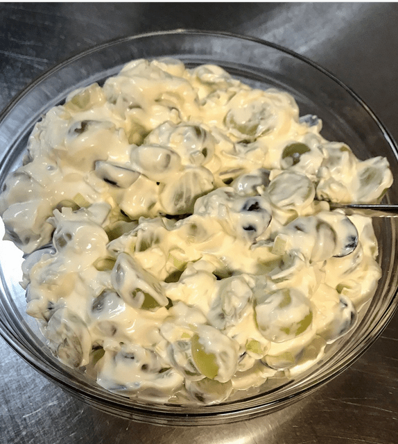 Druesalat i rømme og majones passer både som pålegg på brødskiven, og som tilbehør både til koldtbord og til en god kjøtt eller fiskemiddag. Dette er en enkel salat som er proppfull av smak og garantert ikke vil skuffe. Perfekt som tilbehør til de fleste typer retter.