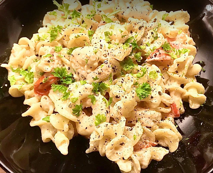 Smak til med krydder og bland inn ferdigkokt pasta.